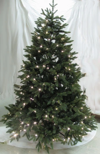 Full, pre-lit with clear LED lights artificial woodland spruce tree.