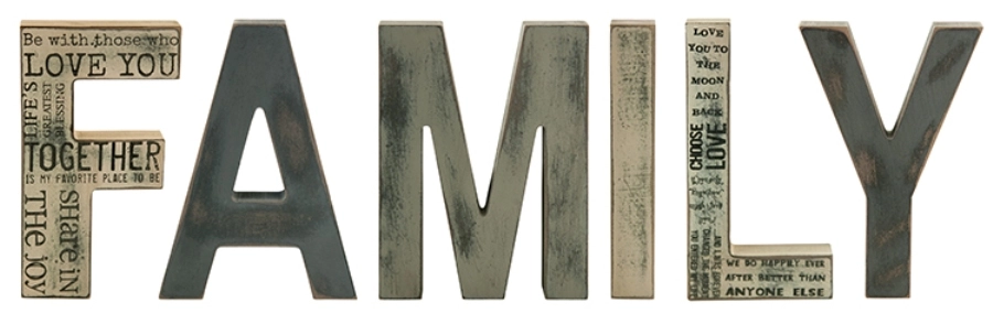 Free standing wooden block letters that spell the word “Family,” each measuring approx. Each has it’s own distressed look, some with words of family love. Designed by Barbara Lloyd.