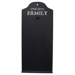Wooden Family calendar holder is painted black and a decorative flourish painted in ivory. Black knob screws on to hold a 12″ x 12″ calendar. Wooden bar attached at the bottom to hold a pen or marker. Pre-drilled hole at the top for hanging.