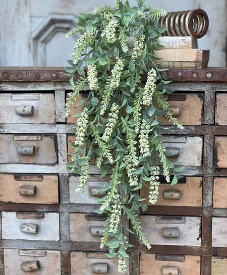 Floral Hanging Drop Stem – Spring & Summer Foliage Collection – A beautiful melody of lightly flocked spear shaped leaves punctuated with clusters of berries and spires.
