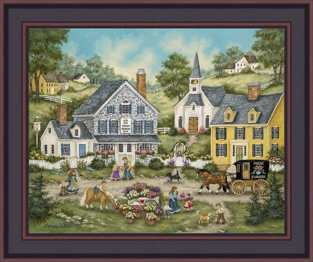 Afternoon Treats by artist Bonnie White. Framed in a black frame with walnut trim as shown from Christmas Tree Hill.