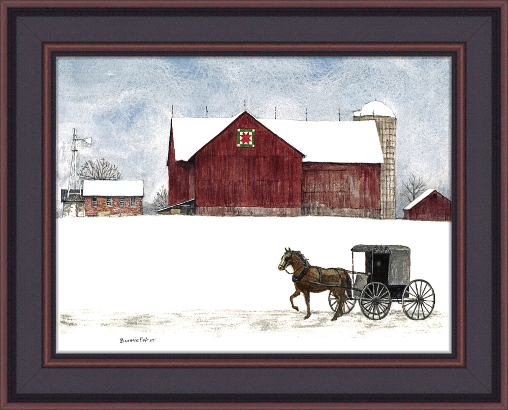 Amish Winter by artist Bonnie Fisher. Framed in a black frame with walnut trim as shown from Christmas Tree Hill. We have a large selection of Bonnie Fisher Country Art prints.