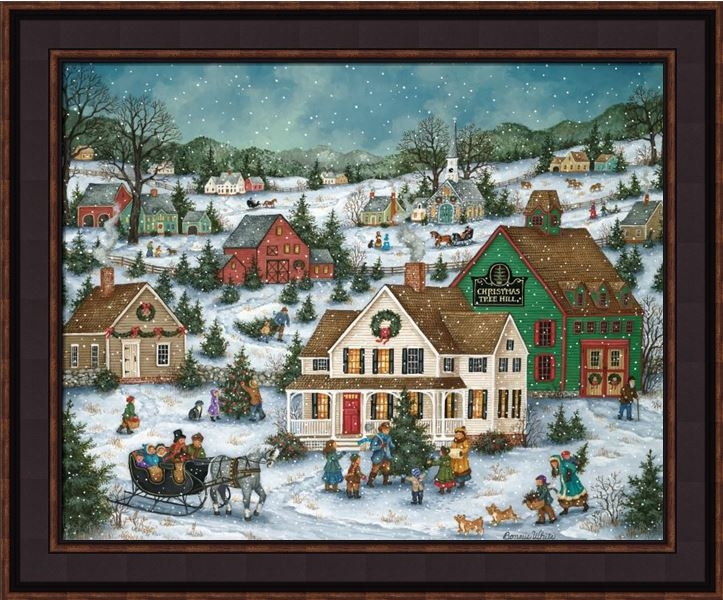 The Christmas Tree Hill print by artist Bonnie White perfectly capture the essence of small town living in the winter months. Featuring a quaint village, the folk art print incorporates plenty of detail to make the design really come to life. From the snow on the ground to the detailed villagers shown engaging in everyday activities, this print is one you’ll want to add to your holiday collection. The design features an assortment of villages on a snowy hillside with plenty of Christmas trees dotting the landscape. A big green building also has a sign that reads Christmas Tree Hill. This piece is one of our favorite Bonnie White Folk Art prints.