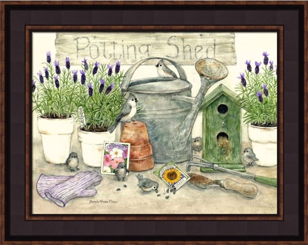 Lavender wall art is a must-have addition to any country cottage or rural home. Designed by artist Bonnie Fisher, the lavender painting includes lavender plants, a watering can, a bird house and a chickadee. The lavender art is colorful, charming and ready to hang thanks to the black and taupe frame that accompanies it. Order lavender wall decor for yourself or as a housewarming gift for a friend or family member. In addition to lavender prints framed, check out our large selection of other Bonnie Fisher Country Art prints.