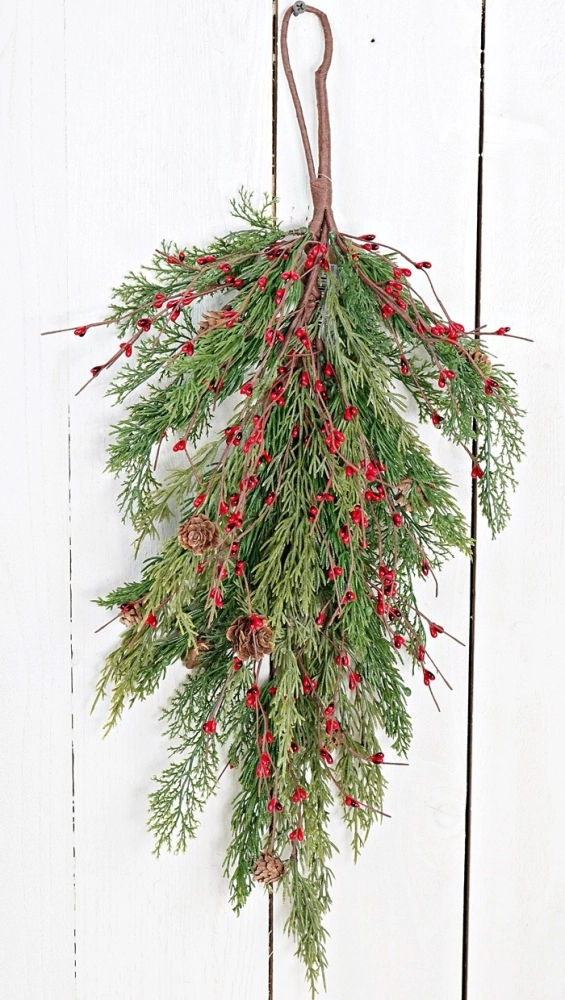 Evergreen Pine with Red Pip Berries Teardrop – Seasonal Home Decorations